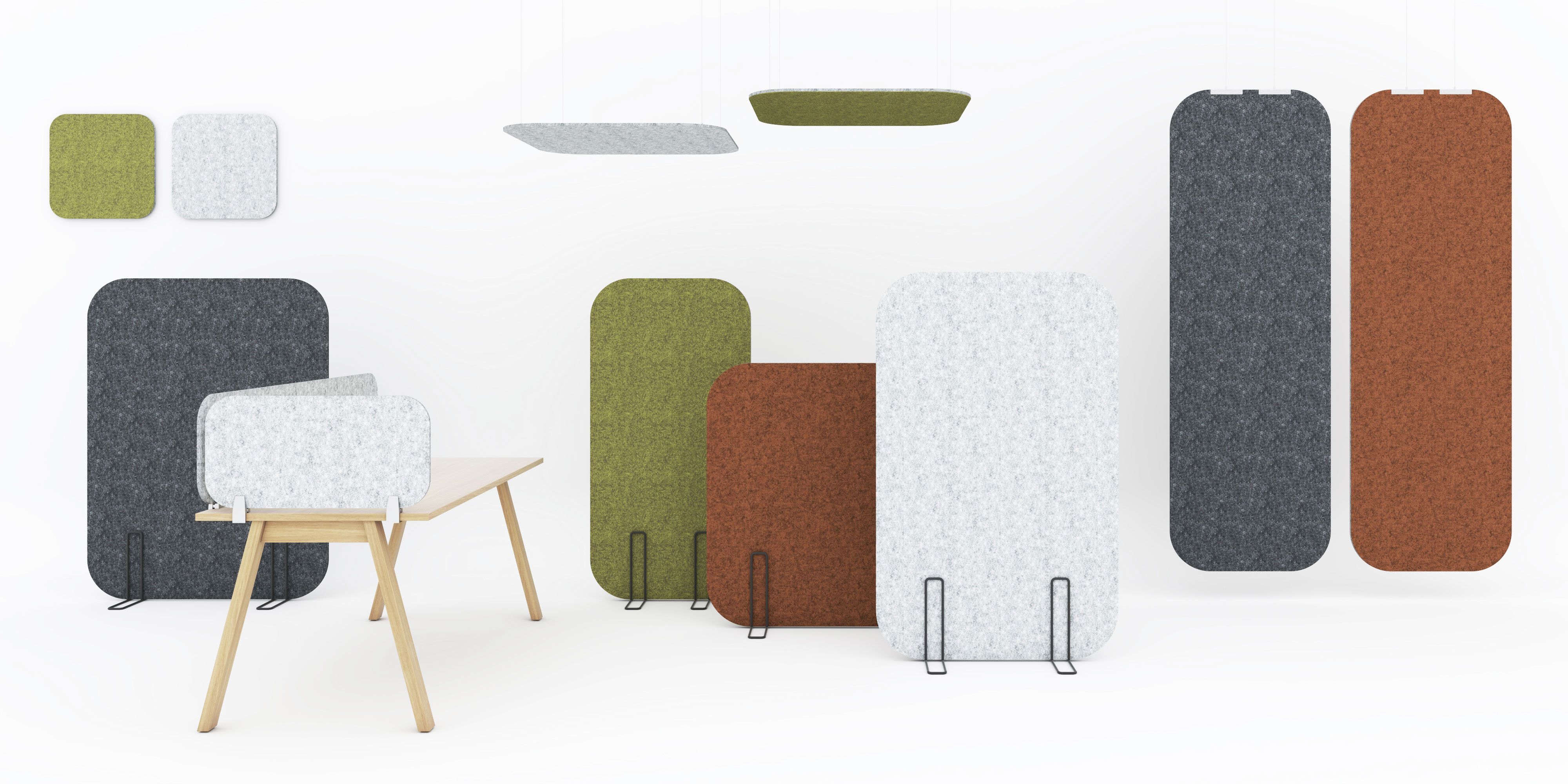 The elements of the collection in its basic version are made of PET boards. Additional layers of acoustic felt allow for a wider choice of colours and make the product look more attractive.