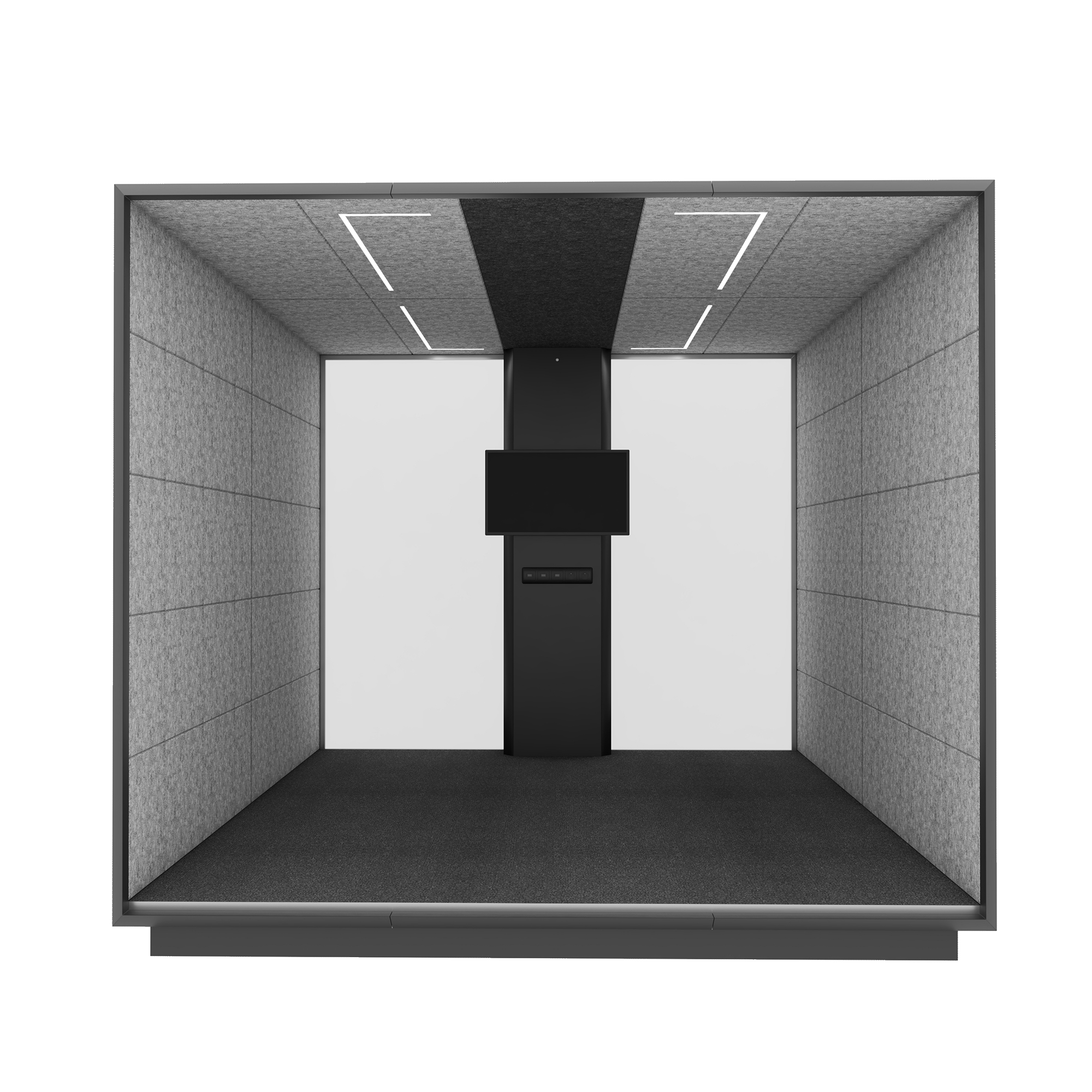 The box's distinctive feature is its metal frame made of a triangular profile. Upholstered panels filled with acoustic foam or panels made of PET plates ensure excellent acoustic parameters inside the booth. The back wall of the cubicle can be either upholstered or glass, depending on your needs.