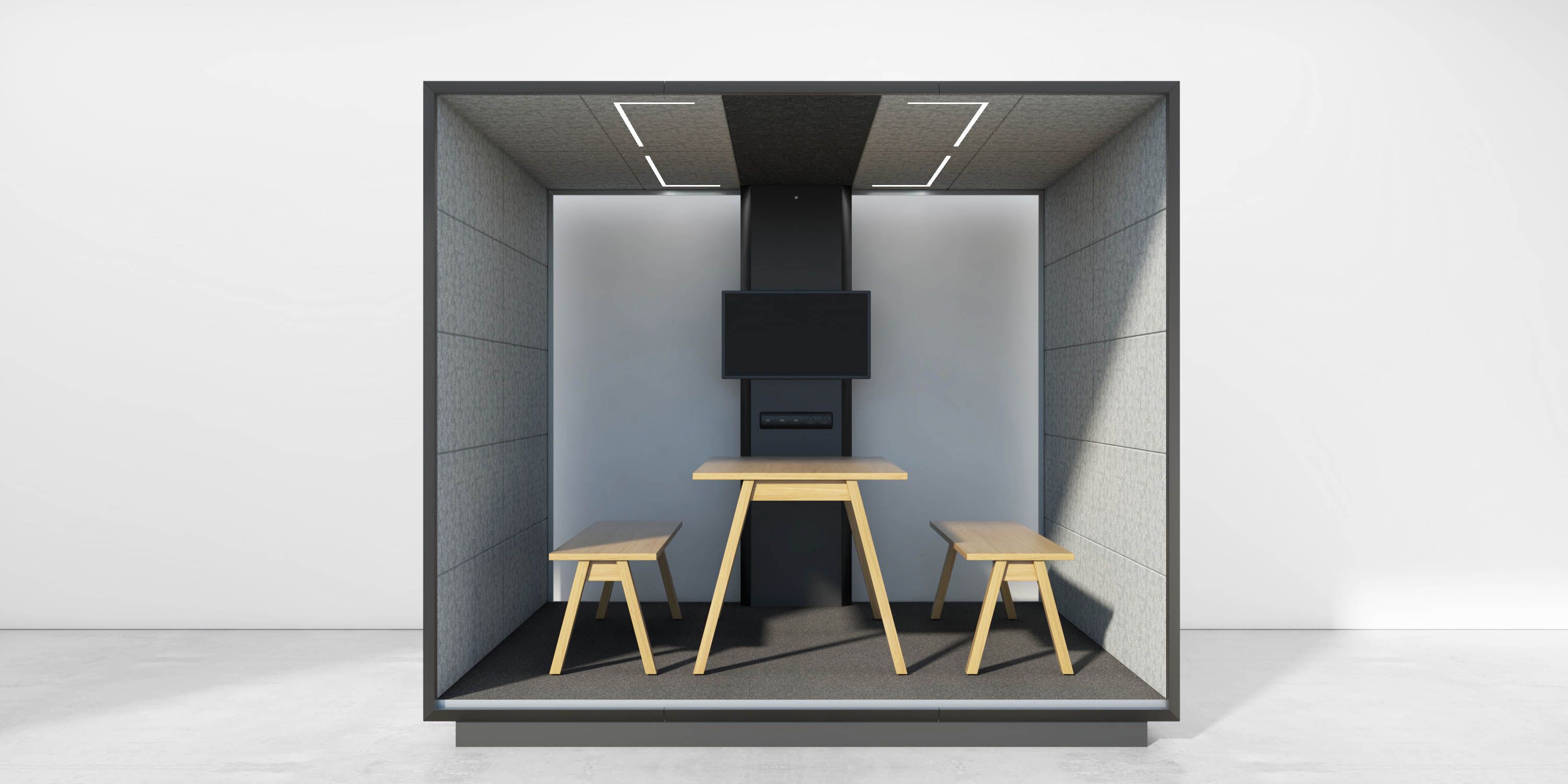 A free-standing acoustic box closed with a glass door, designed for four people who can work in a seated position. The cubicle is equipped with a table and a multimedia panel, which allows for its versatile use.