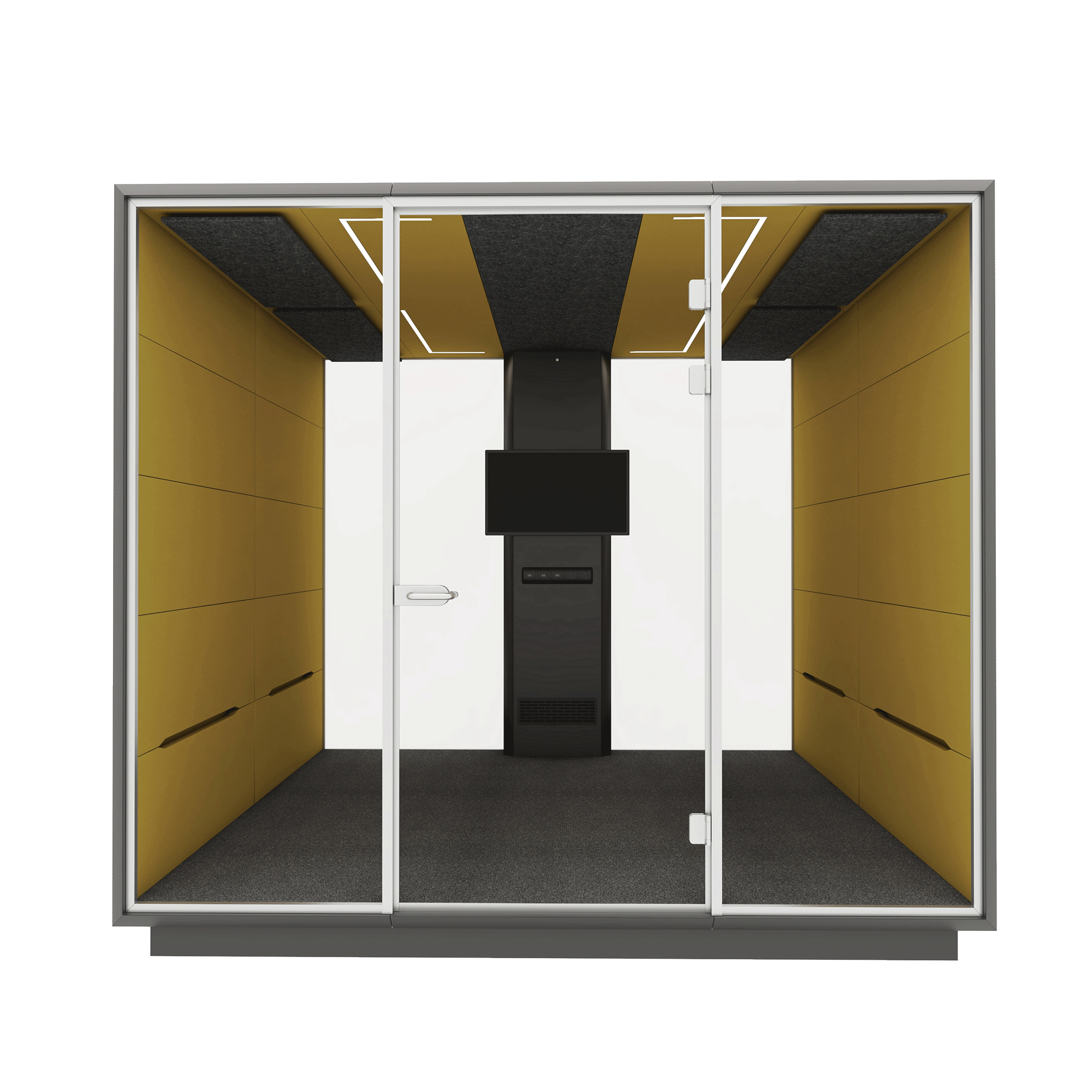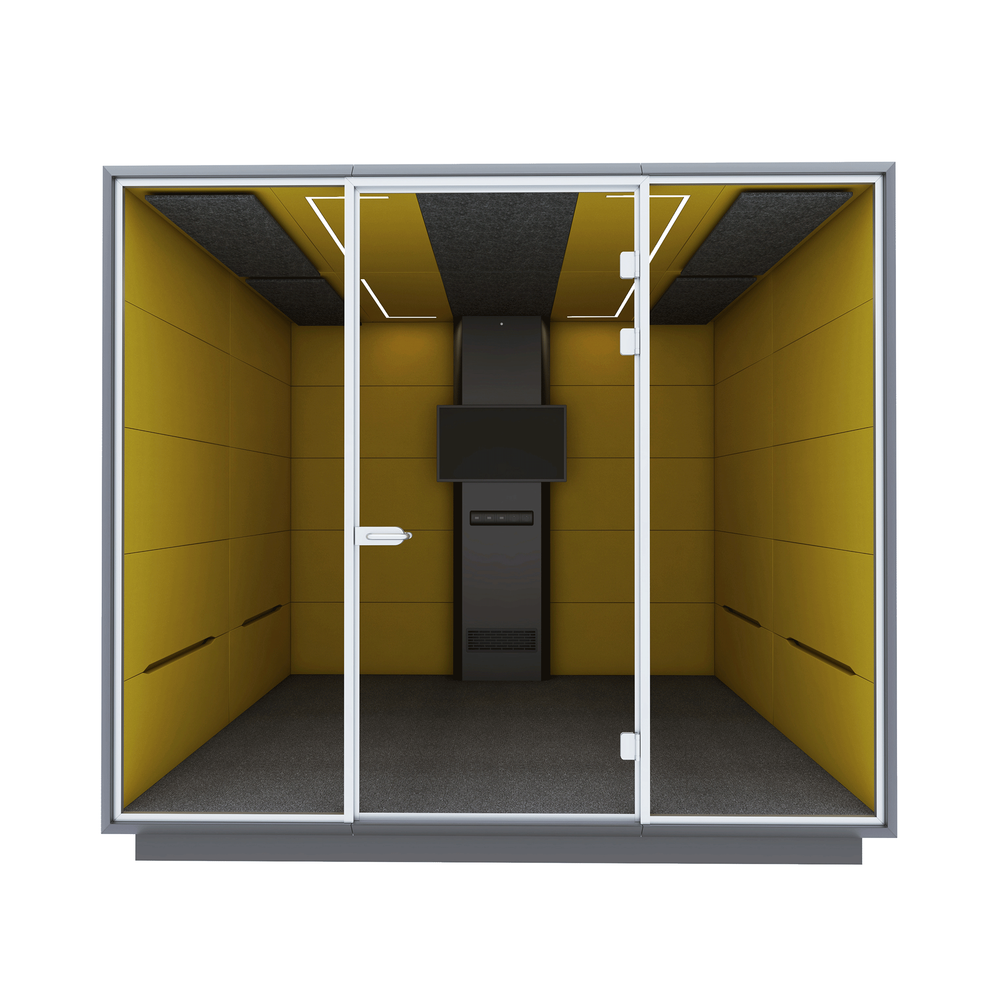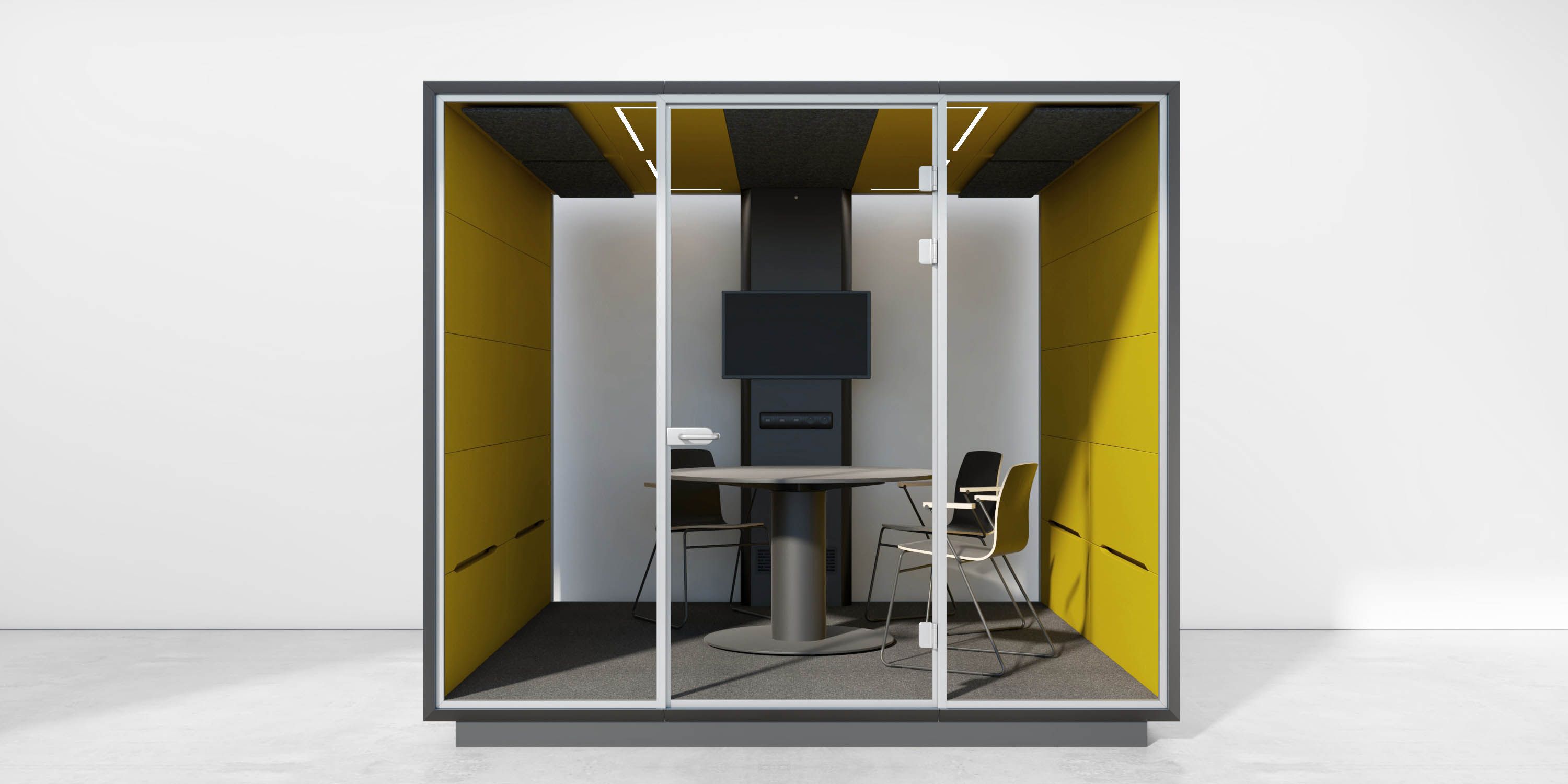 A free-standing acoustic box closed with a glass door, designed for four people who can work in a seated position. The cubicle is equipped with a table and a multimedia panel, which allows for its versatile use.