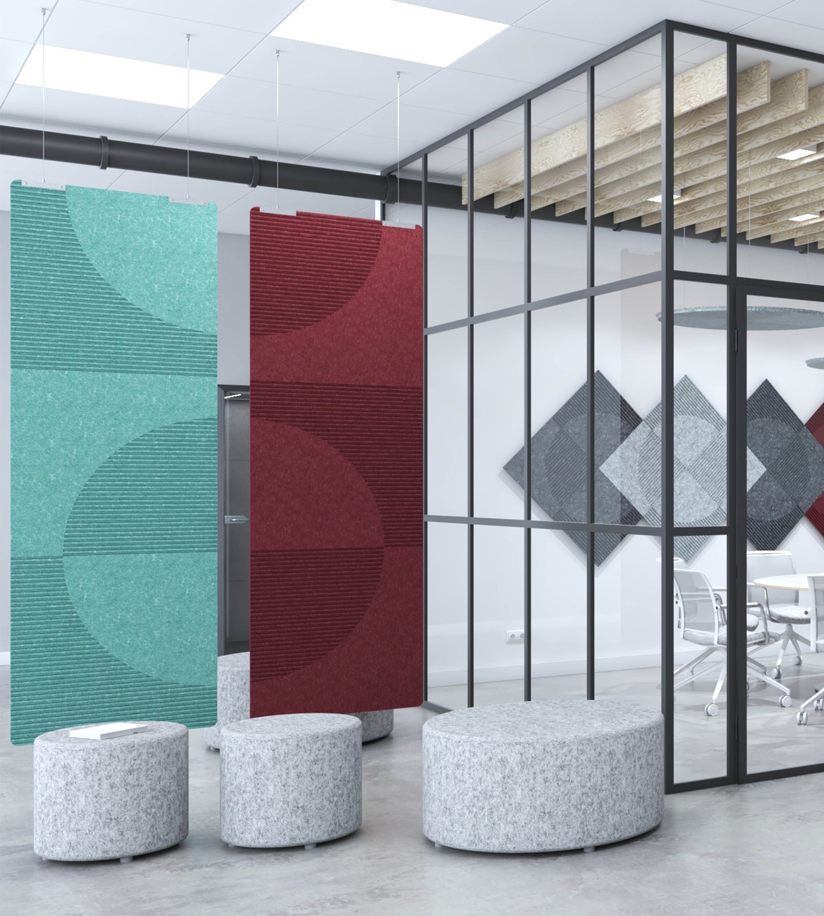 materiał PET, z którego wykonane są panele akustyczne ma właściwości dźwiękochłonne. Wzory na panelach uzyskane poprzez frezowanie równoległych linii dodatkowo rozpraszają dźwięk.