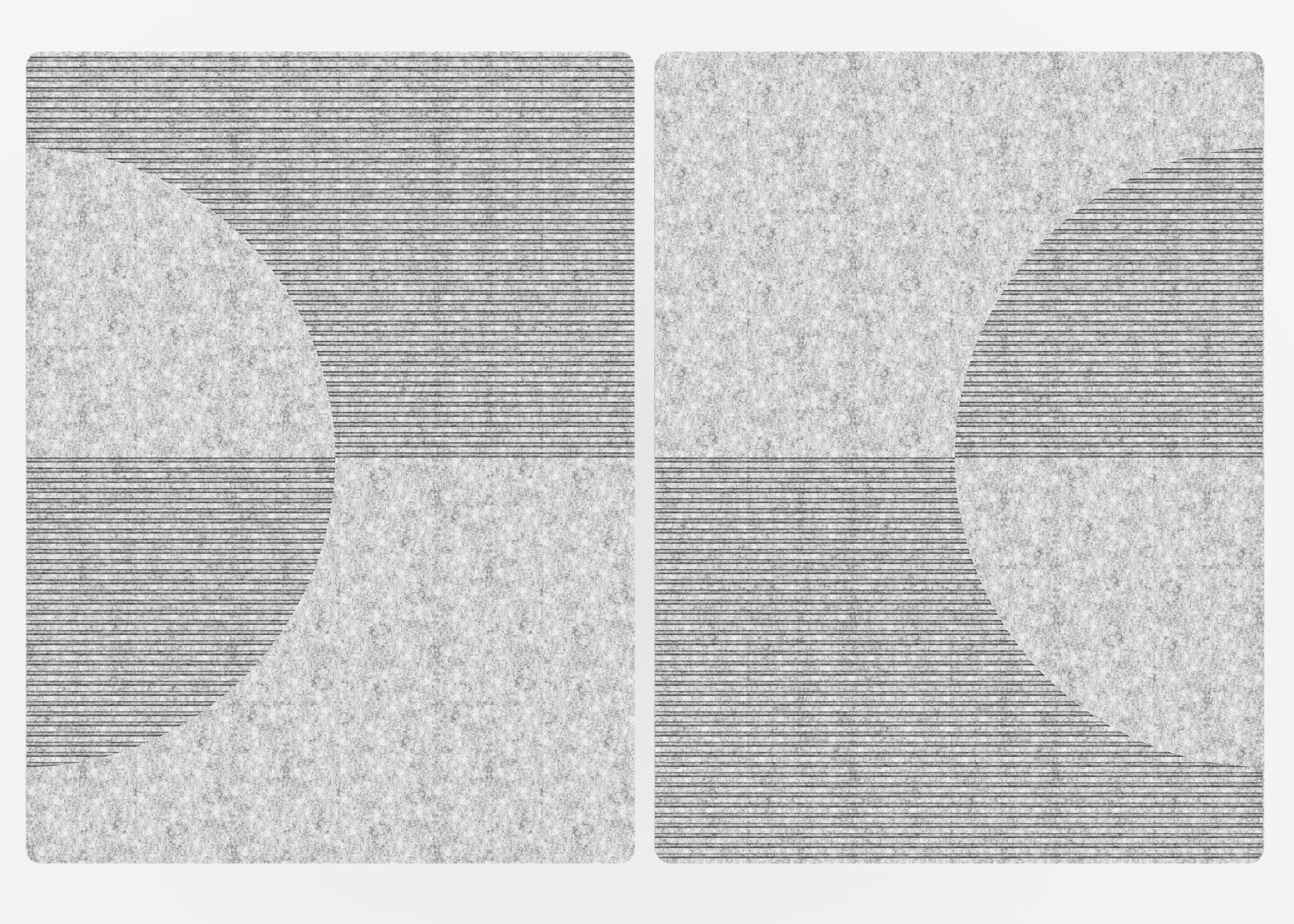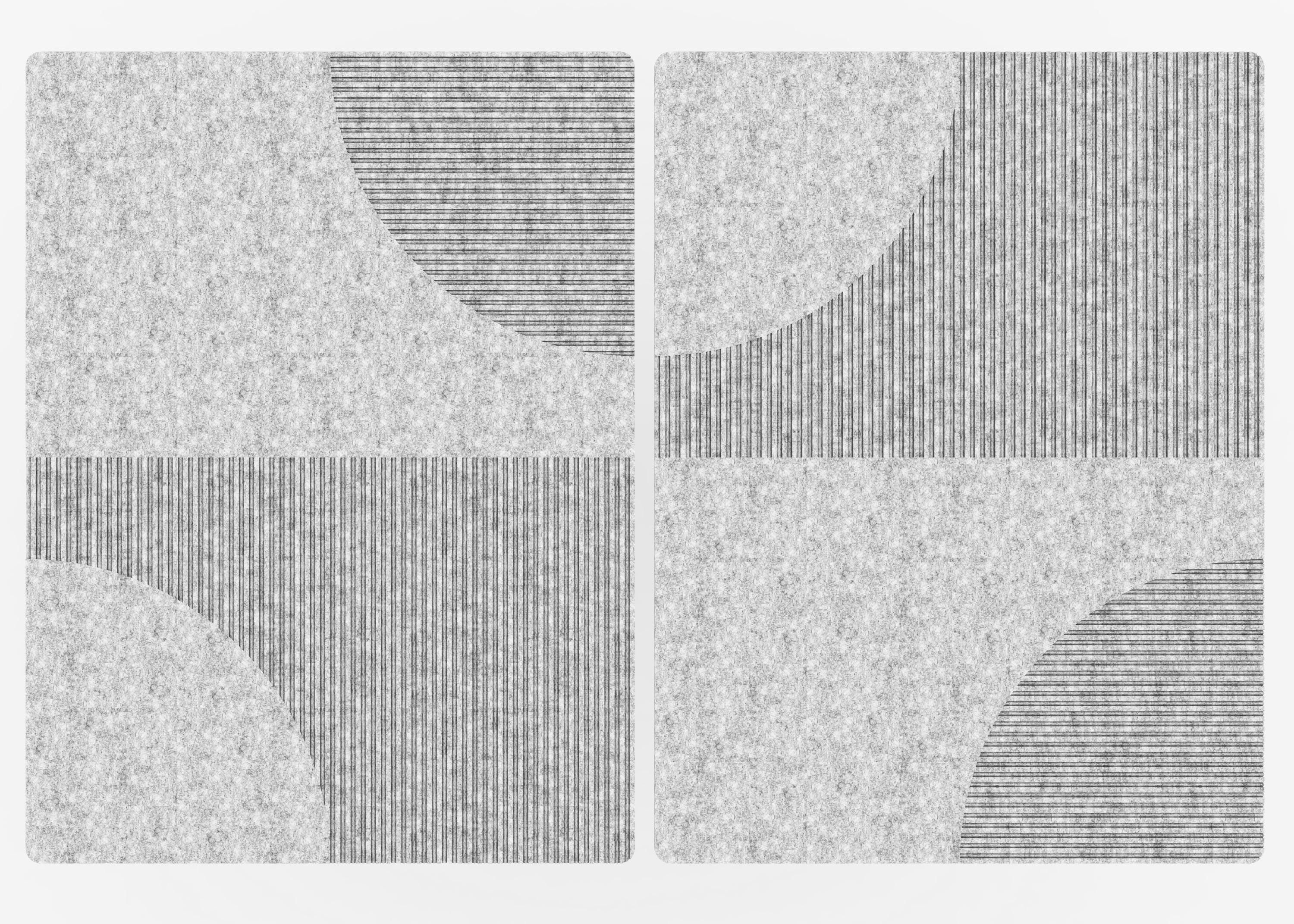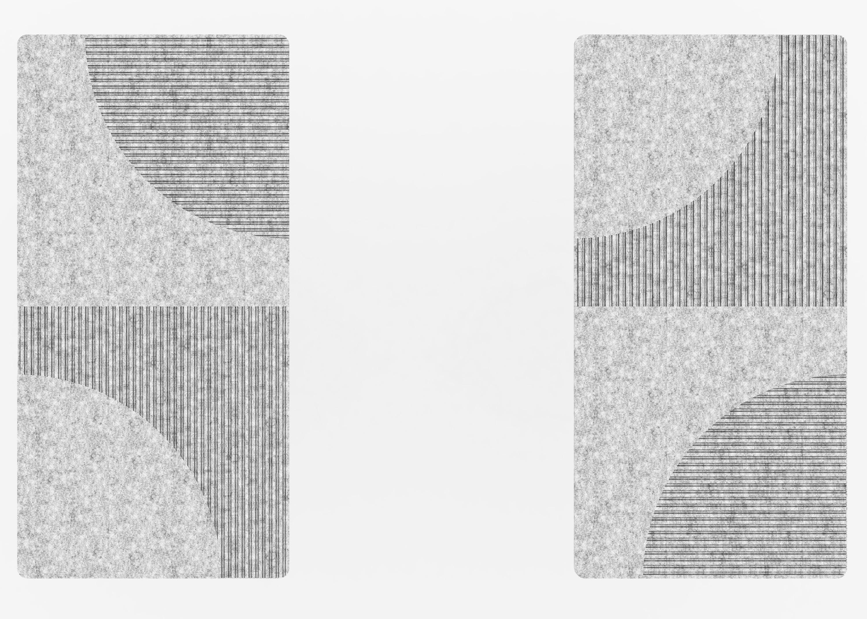 Elementy kolekcji wykonane są z płyt PET, frezowanych dla uzyskania strukturalnych wzorów. W zależności od wzoru, linie frezowań ułożone są prostopadle lub równolegle względem siebie.