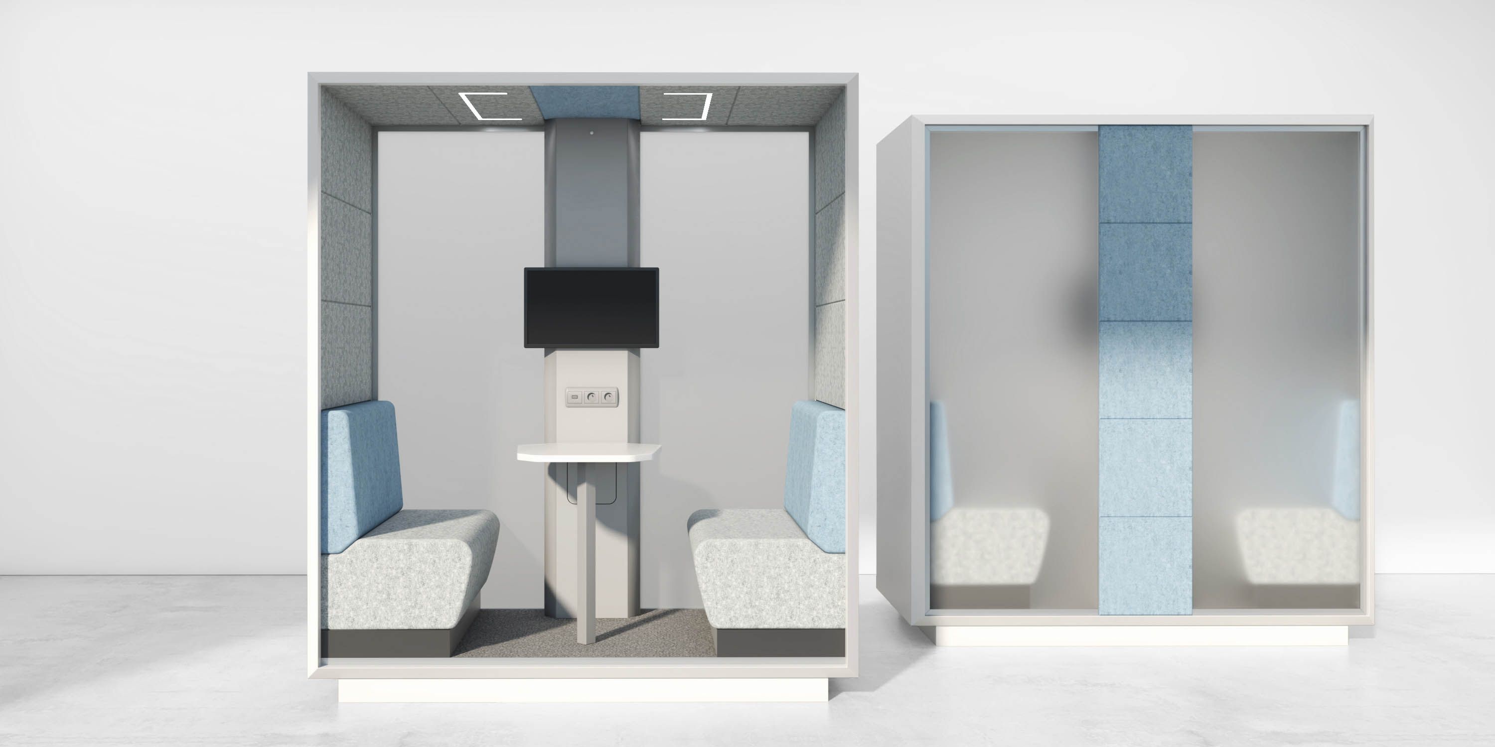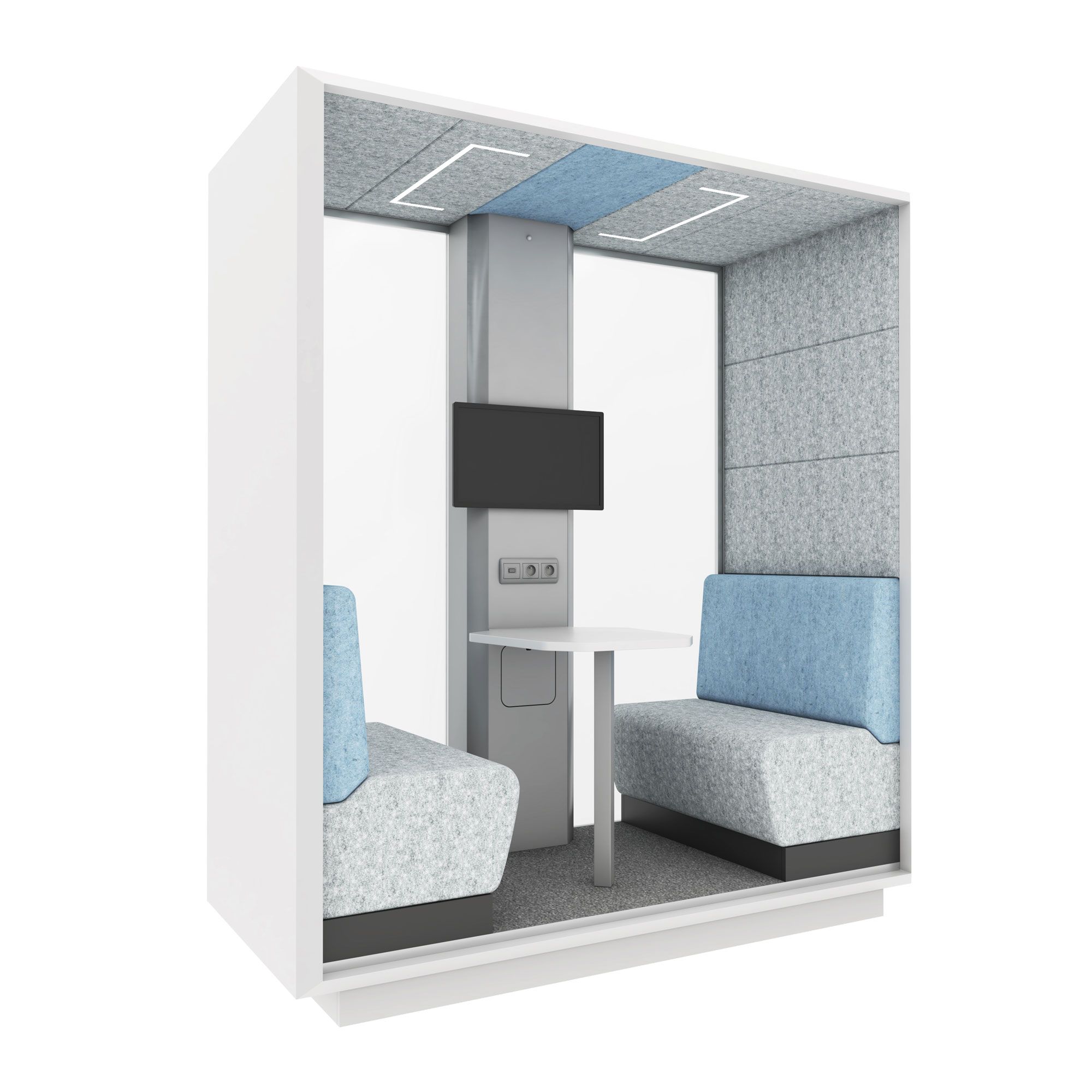 Wolnostojący boks akustyczny otwarty, mieszczący dwie osoby. Praca w pozycji siedzącej. Dzięki stolikowi i panelowi multimedialnemu boks posiada wiele wariantów wykorzystania.