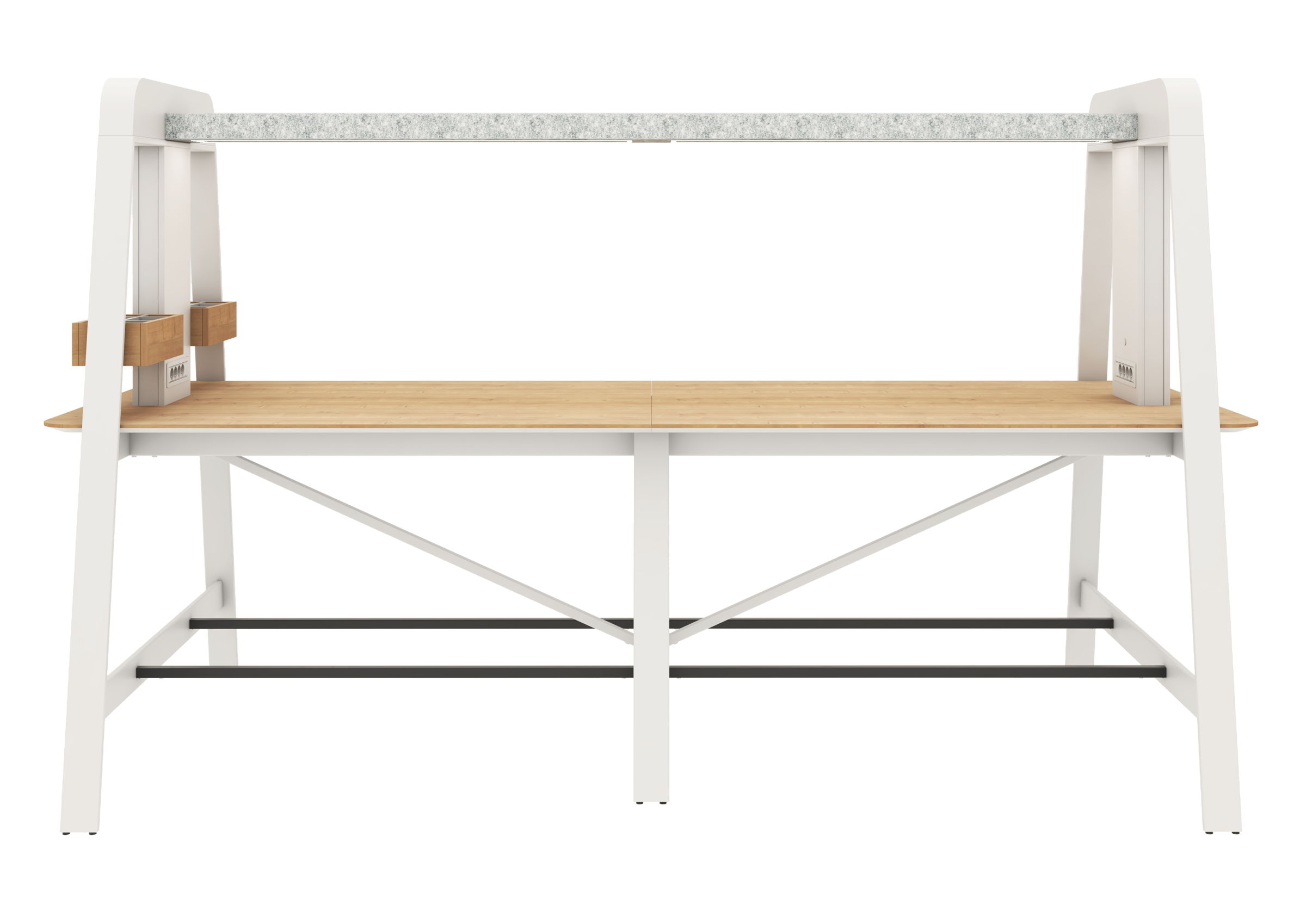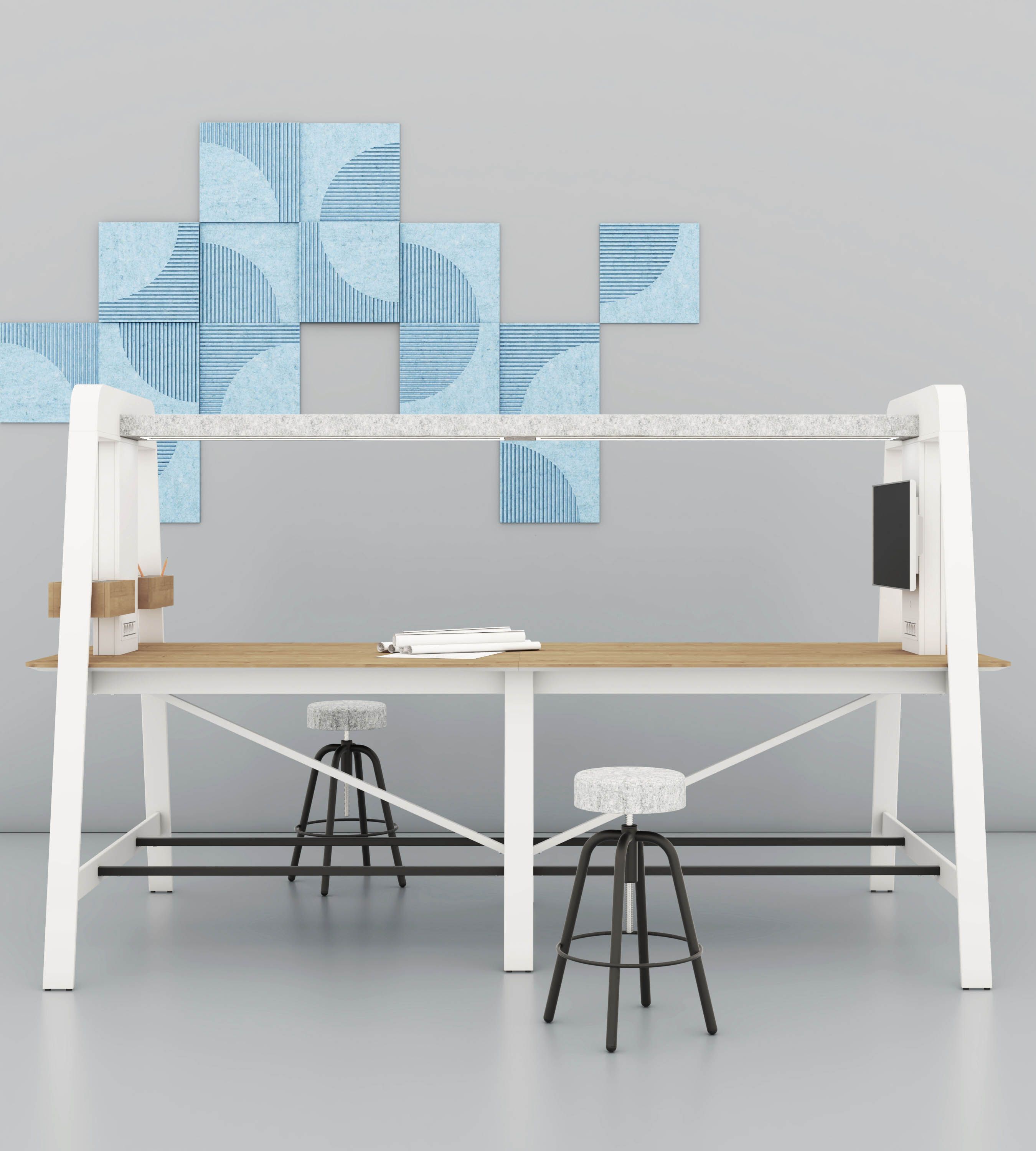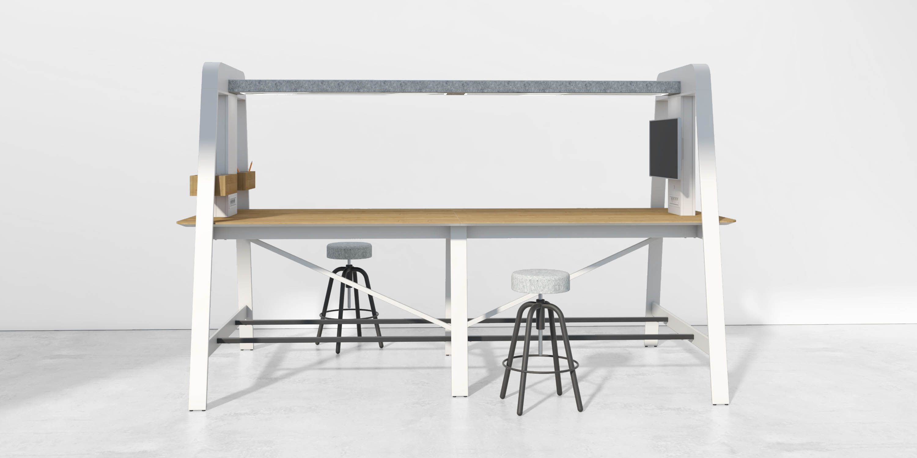 Dwie metalowe ramy w kształcie litery A zostały połączone w górnej części panelem oświetleniowym z płyt PET. Podcięta krawędź blatu nadaje konstrukcji lekkości. Panel multimedialny może być wyposażony w organizery biurowe, doniczki na roślinność, monitor TV lub tablicę suchościeralną.